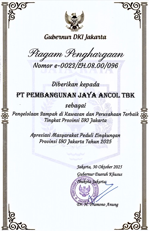 PT Pembangunan Jaya Ancol Tbk memperoleh Apresiasi Masyarakat Peduli Lingkungan tahun 2025 untuk kategori Pengelolaan Sampah di Kawasan dan Perusahaan Terbaik tingkat Provinsi DKI Jakarta pada Selasa, 4 November 2025 di Hotel Borobudur Jakarta.