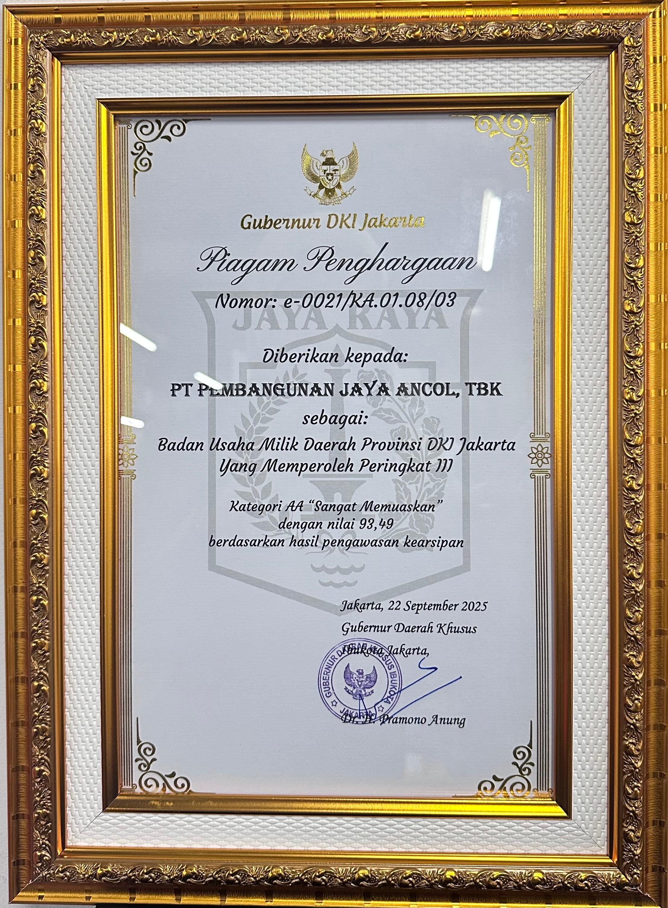 Penghargaan ini diberikan langsung oleh Bp Pramono Anung – Gubernur DKI Jakarta kepada Bp Affendi - Senior Vice President Property & Resort Management PT Pembangunan Jaya Ancol Tbk di Acara Festival PustaKarsa 2025 di Taman Ismail Marjuki (TIM) pada tanggal 15 Oktober 2025.