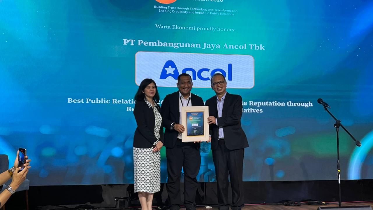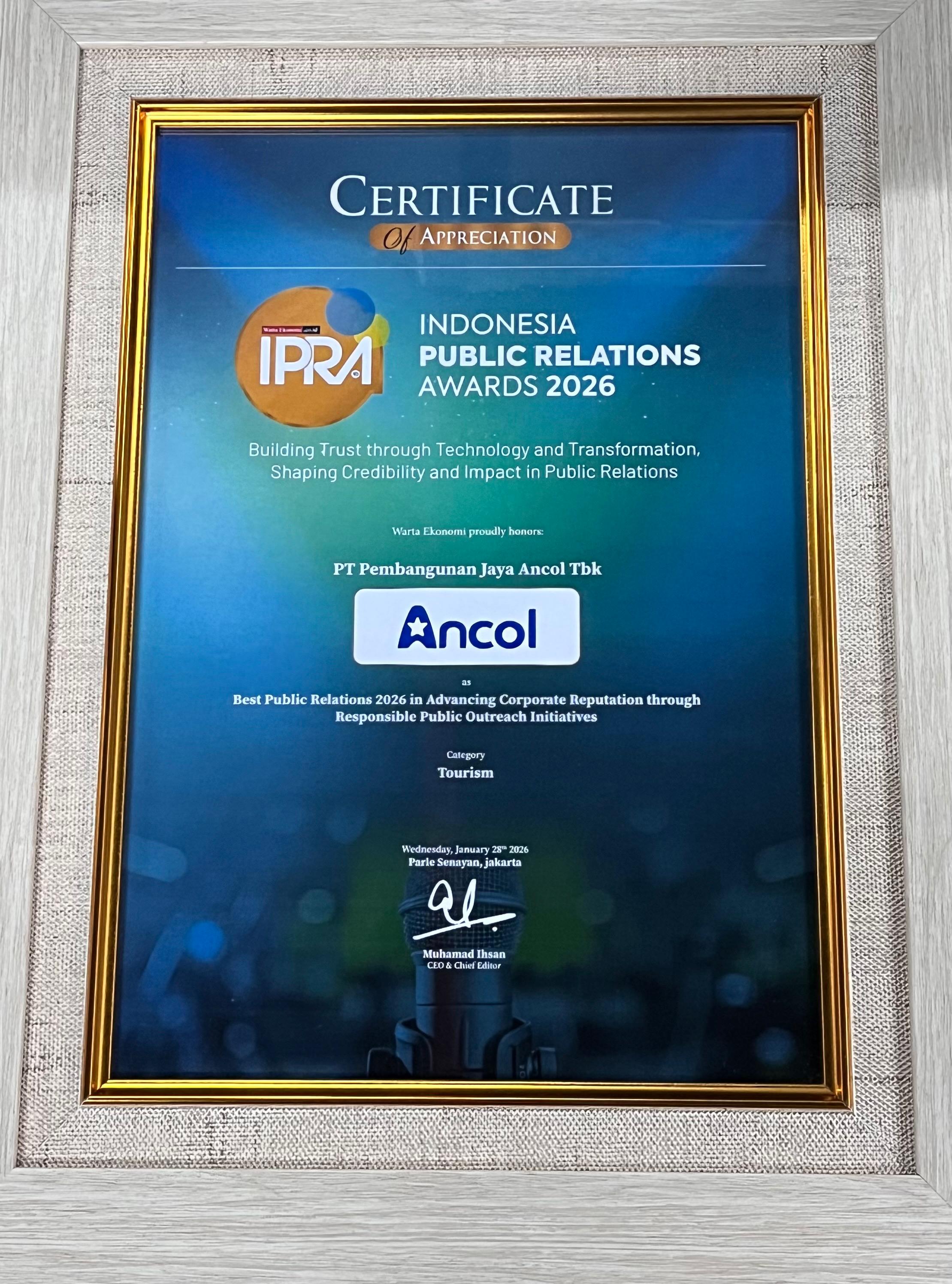 Ancol menerima Penghargaan Indonesia Public Relations Award 2026 – kategori Tourism dari Media Warta Ekonomi. Penghargaan ini diserahkan langsung oleh CEO & Chief Editor Warta Ekonomi Grup, Bp Muhamad Ihsan bersama Ibu Sari Soegondo - Ketua Umum Asosiasi Perusahaan Public Relations Indonesia (APPRI) kepada Vice President PT Pembangunan Jaya Ancol Tbk, Bp Martua Hami Siregar pada hari Rabu 28 Januari 2026 di Parle Senayan Park - Jakarta Selatan.