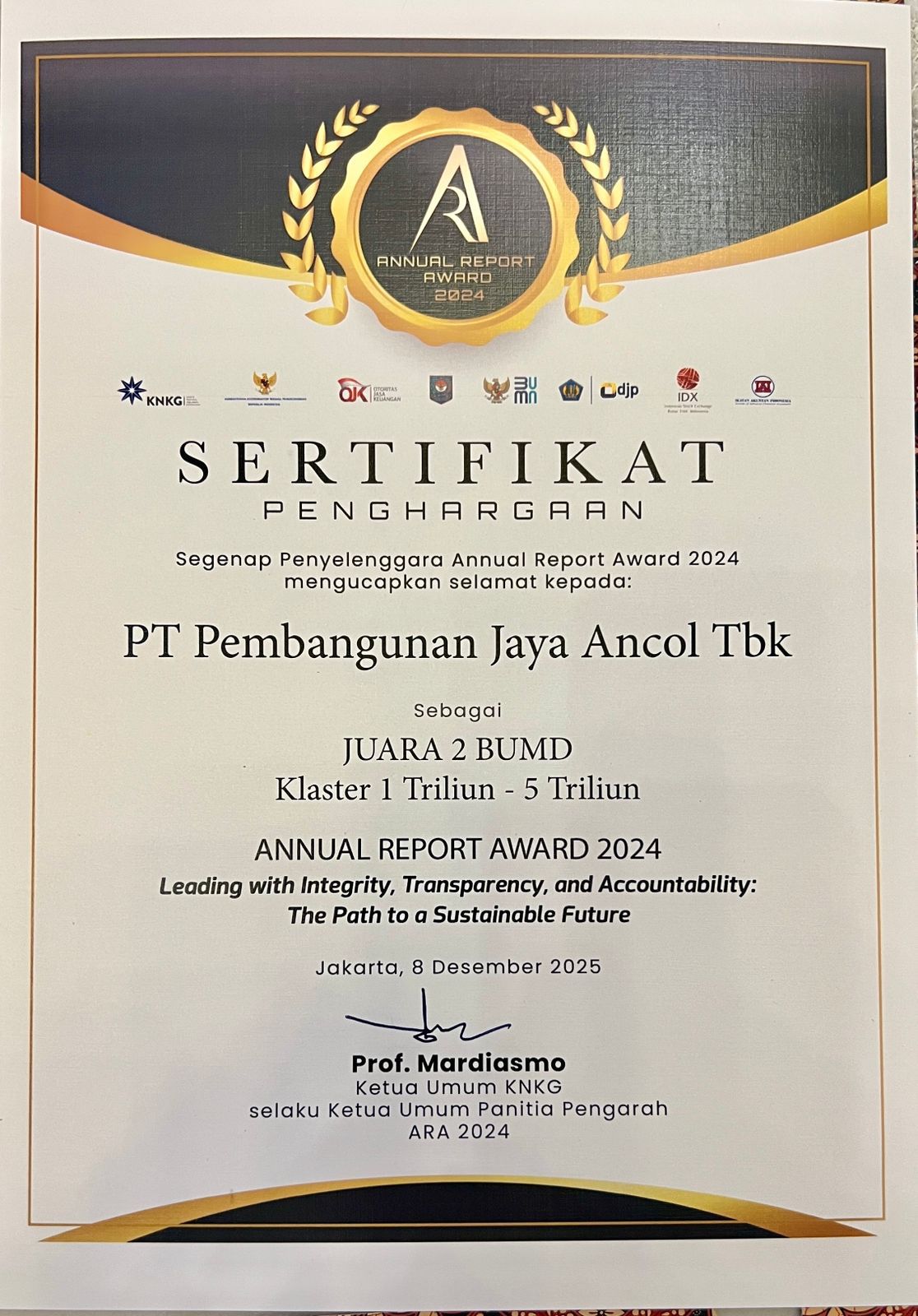 PT Pembangunan Jaya Ancol Tbk (PJAA) meraih Predikat Juara 2 untuk kategori BUMD klaster Perusahaan dengan Revenue Rp1–5 Triliun dalam ajang Annual Report Award (ARA) 2024, di Bursa Efek Indonesia – 8 Desember 2025. Penghargaan Predikat Juara 2 diterima langsung oleh Direktur PT Pembangunan Jaya Ancol Tbk Bp Daniel Nainggolan.